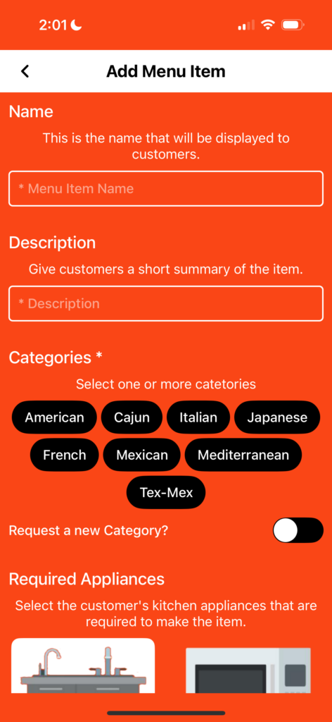 Create your first menu item. Describe your item in detail (make it unique, make it sizzle!) For serving size, add how many people your item will serve. Make sure your price reflects your serving size.