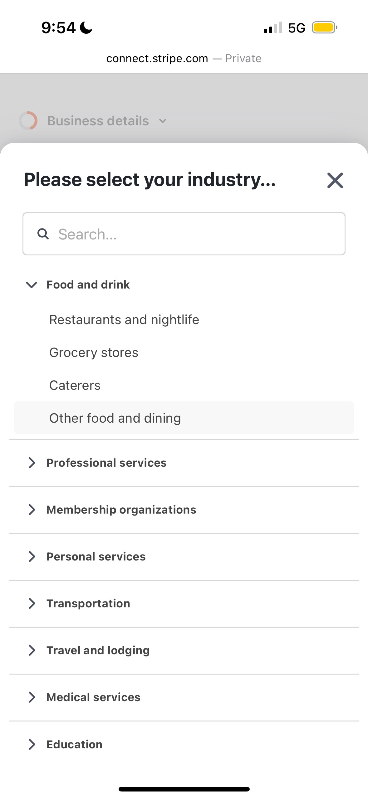 In the Business details step, select the dropdown menu and select “Food and Drink”.
